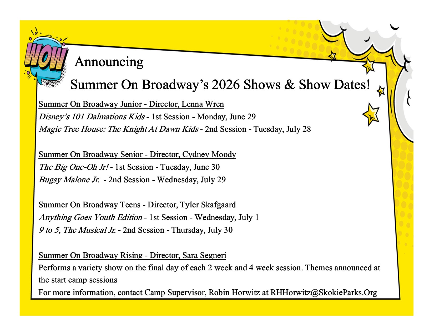 February 8: Camp registration for Skokie residents begins at noon. February 22: Camp registration for non-residents begins at 8:30 a.m. *Indicates that Extended Camp is available